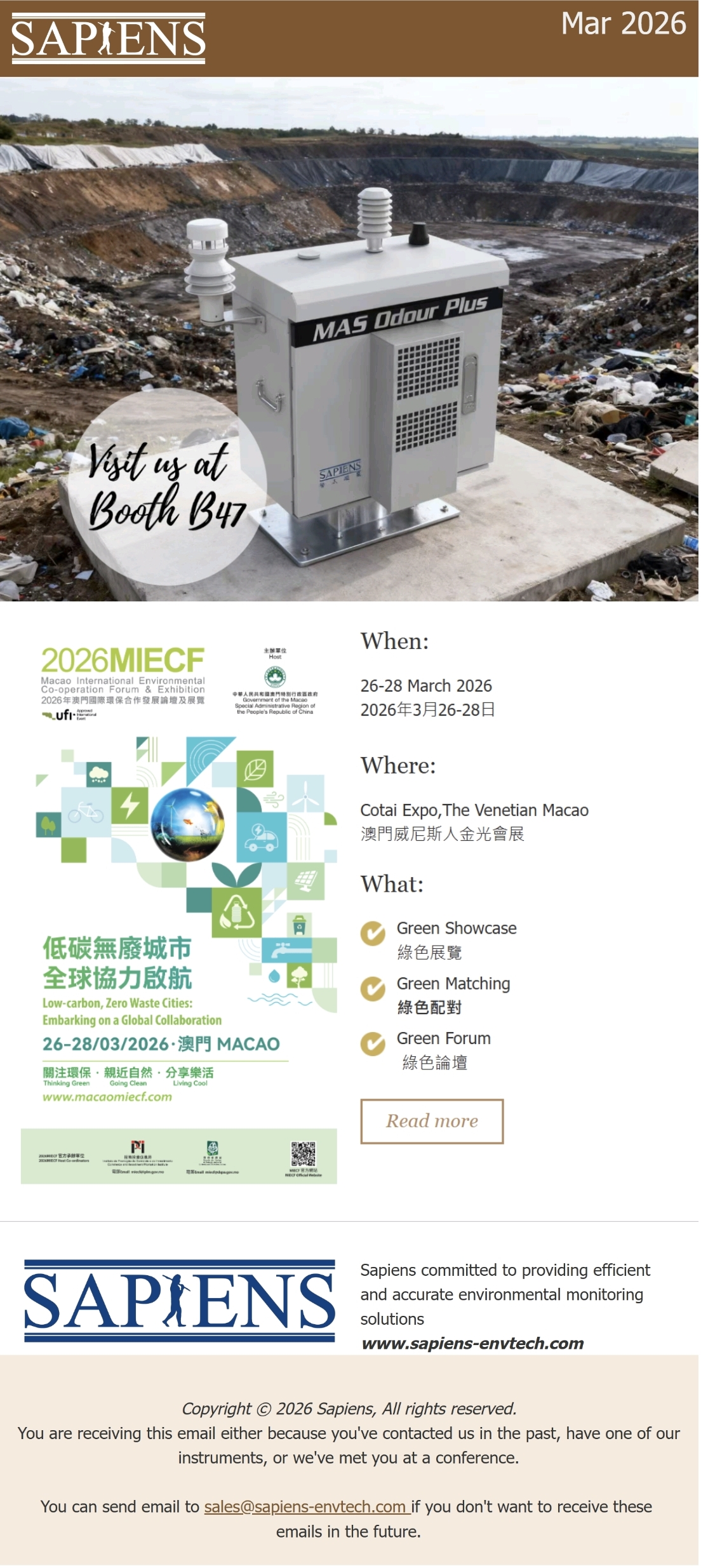 We are excited to invite you to meet the Sapiens team at the 2026 Macao International Environmental Co-operation Forum & Exhibition (2026 MIECF) this March. Visit us at Booth #B47 to discover how our sustainable solutions and eco-friendly technologies drive low-carbon, zero-waste practices for businesses and smart cities.